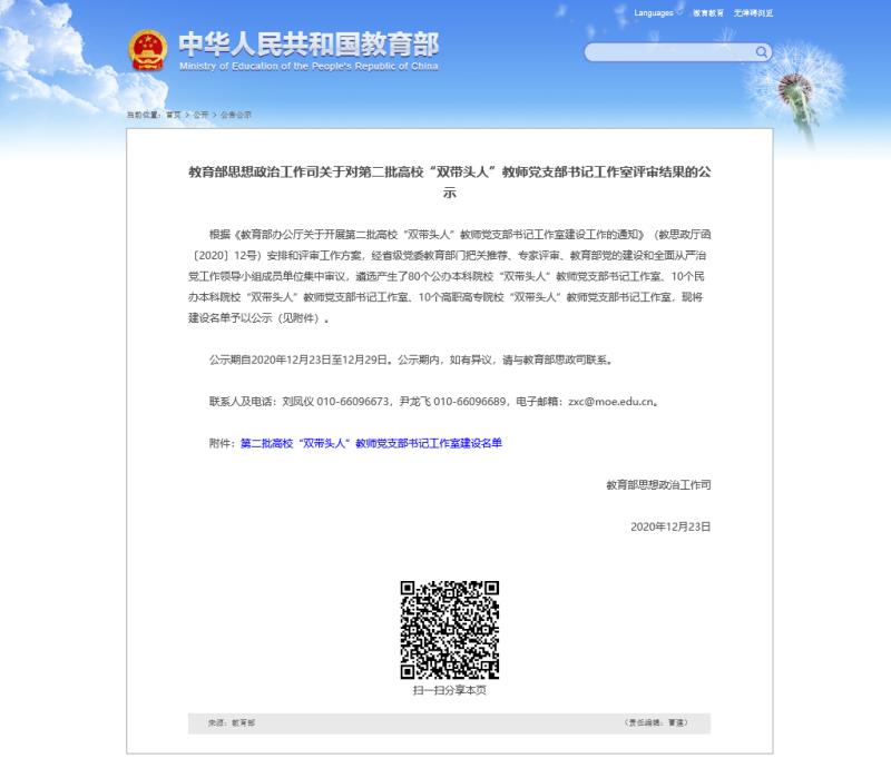 2020年12月23日,据教育部门户网站公示消息,依照《教育部办公厅关于开展第二批高校“双带头人”教师党支部书记工作室建设工作的通知》(教思政厅函〔2020〕12号)安排和评审工作方案,经省级党委教育部门把关推荐、专家评审、教育部党的建设和全面从严治党工作领导小组成员单位集中审议,遴选产生了80个公办本科院校“双带头人”教师党支部书记工作室、10个民办本科院校“双带头人”教师党支部书记工作室、10个高职高专院校“双带头人”教师党支部书记工作室。我院教工一支部书记刘伟博士“双带头人”工作室榜上有名。据悉,这是内蒙古自治区高校唯一入选的工作室。