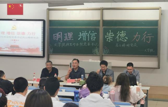 5月28日晚,yl9193永利集团在行知楼118教室举办了“人文之夜”第十七次读书报告会,读书会的主题是:“明理、增信、崇德、力行——对话校党委副书记高云峰研究员”。本次读书会邀请到了学校党委副书记高云峰研究员,yl9193永利集团党委书记高林广教授、教工一支部书记刘伟博士,以及yl9193永利集团研究生、本科生共200余人参加了本次活动,赵玉龙博士主持了会议。