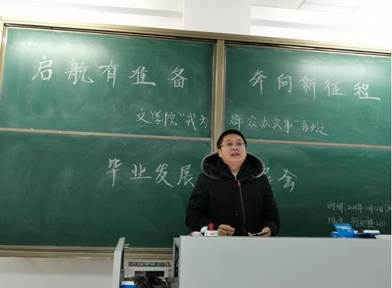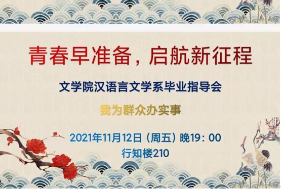 2021年11月13日,我院在盛乐校区行知楼210召开了主题为“启航有准备,奔向新征程”的毕业生发展指导会。本次会议由汉文系、汉语系、教务办共同举办,教工一支部书记刘伟博士、汉语言文学系副主任胡素莲博士、教务办公室吴永盛老师出席了会议,汉文系、汉语系、秘书系全体毕业生共300余人参加了会议。