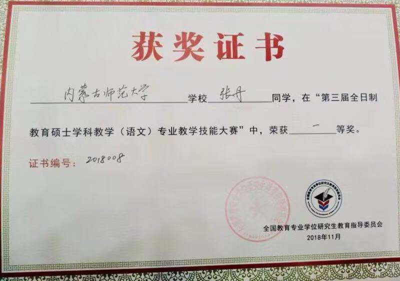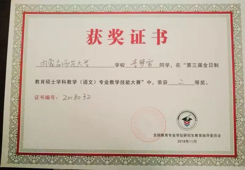 11月16-19日,由全国教育专业学位研究生教育指导委员会、全国高等教育学会语文教育专业委员会、江西师范大学联合主办的第十八届中国高等教育学会语文教育专业委员会年会暨第三届全国教育硕士学科教学(语文)专业教学技能大赛(决赛)”在江西师范大学举行。我院学科教学(语文)专业研究生张丹、李梦雪代表我校参加了本次比赛。经过层层选拔,激烈角逐,最终,张丹、李梦雪从120名参加决赛的选手中脱颖而出,分别获一等奖、二等奖。这充分展示了我院研究生扎实的专业知识和高水平的教学技能水平,同时,也在全国性大赛中展现了我院研究生的风采。我院教师徐雪梅、郭亚明被大会评为“优秀指导教师”,永利官网获得“优秀组织奖”。