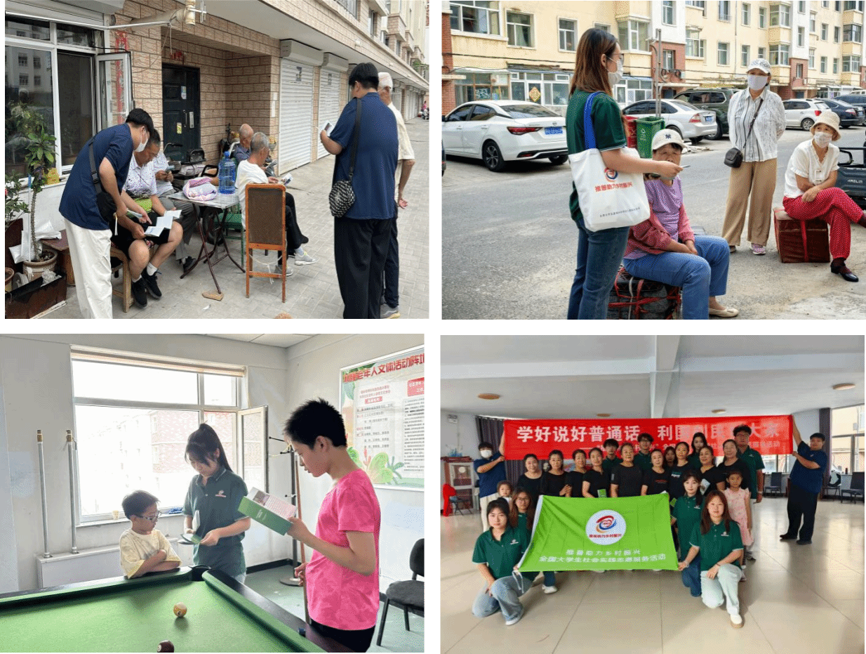 8月1日下午,团队成员来到锡林浩特锡林社区、杭盖街道福泰园小区等四个社区面向社区居民、社区工作者开展普通话推广活动。队员们来到社区小广场、党群服务中心等地为正在社区进行文体活动的老人、儿童、青少年及社区工作者带去语言文字的“春风”。队员们走访社区家庭,通过问卷调查和面对面交流,了解当地普通话使用情况与学习难点,并发放了《普通话学习手册》。
