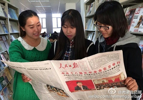 11月2日上午,yl9193永利集团团总支组织该院学生深入学习十八届五中全会精神,切实领悟“两个一百年”奋斗目标的深刻内涵。图为学生正在学习十八届五中全会公报。袁耀先 摄