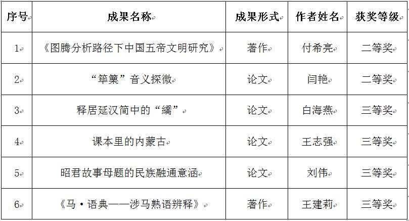 11月12日,内蒙古社会学科网公示了第九届内蒙古自治区哲学社会科学奖评选结果。我院教师获得二等奖2项,三等奖4项。