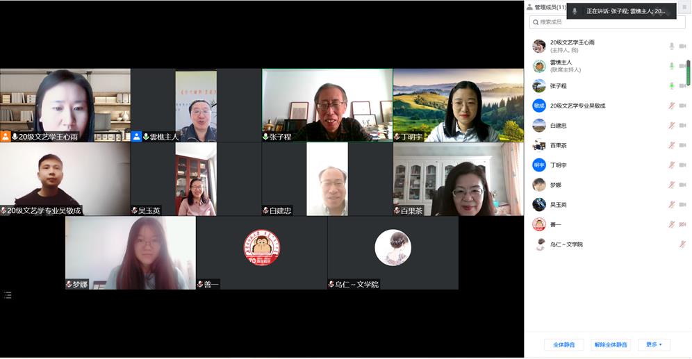 2022年4月24日上午,我院文艺学专业硕士研究生课题论证会在腾讯会议举行。文艺学专业研究生导师万奇教授,白建忠教授,张树天教授,郭培筠教授,张子程教授,吴玉英副教授,以及本专业20级、21级研究生参加了论证会。会议由学位点主任万奇教授主持。2020级文艺学王心雨、梦娜、丁明宇、吴敬成4位同学依次做了开题报告,分别介绍了选题背景,选题研究价值,研究现状,研究思路方法和研究的具体内容、创新点等。各位导师针对每位研究生的开题报告做了全方位的细致点评。本次论证会是对2020级学生学习成果的检验,也是文艺学专业良好学风的体现。