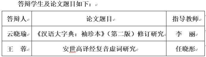 汉语言文字学专业定于2022年5月22日上午(9:00-12:00)召开2022届硕士学位论文答辩会。根据学校《关于做好2022年上半年博士、硕士研究生学位授予工作的通知》《关于做好疫情防控期间2022届研究生毕业答辩工作的通知》的要求,本次答辩采取线上与线下相结合的方式进行,线上使用远程会议软件为腾讯会议(会议号:946627864),线下地点为赛罕校区田楼432教室。本次答辩会特别邀请中国社会科学院教授、博士生导师程荣担任答辩主席。欢迎广大师生参加交流!