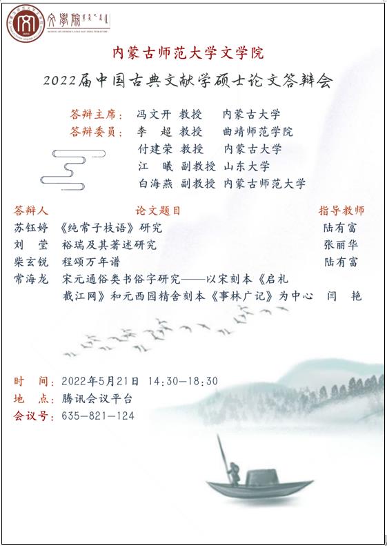 中国古典文献学专业定于2022年5月21日下午(14:30-18:30)召开2022届硕士学位论文答辩会。根据《关于做好2022年上半年博士、硕士研究生学位授予工作的通知》《关于做好疫情防控期间2022届研究生毕业答辩工作的通知》的要求,本次答辩采用网络视频线上答辩的方式,使用的答辩平台为腾讯会议平台,会议号为635821124。内蒙古大学冯文开教授应邀担任本次答辩主席。欢迎广大师生参加交流。