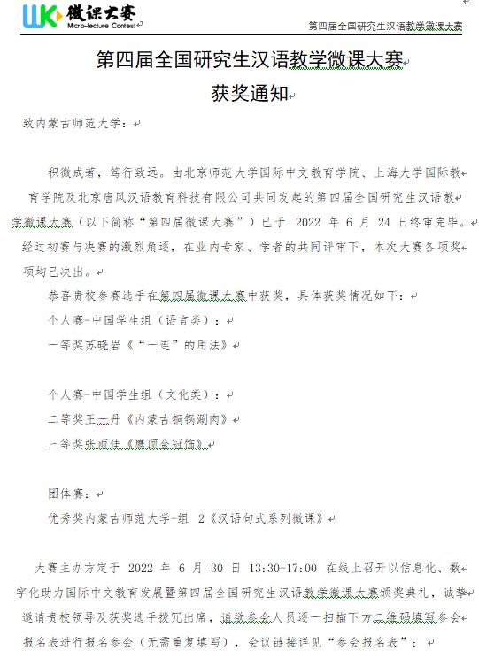 自2021年9月大赛启动以来,校领导、院领导高度重视此项工作。学院组织2020级汉硕进行了初赛,并组建了由内蒙古大学赵金色、丁艳,永利官网国际交流学院陈金香,以及本院任晓彤、胡素莲、白海燕、李瑞春、刘婕、阿婧斯、王伟超等共十位老师组成的专业指导团队。团队分一个“个人赛小组”和两个“团体赛小组”,指导教师在教学内容、教学环节,教学方法、课件制作、视频拍摄、后期处理等各个环节给予参赛选手以专业指导。最终,选送团体参赛作品2个和个人参赛作品10个参加本届全国研究生汉语教学微课大赛。