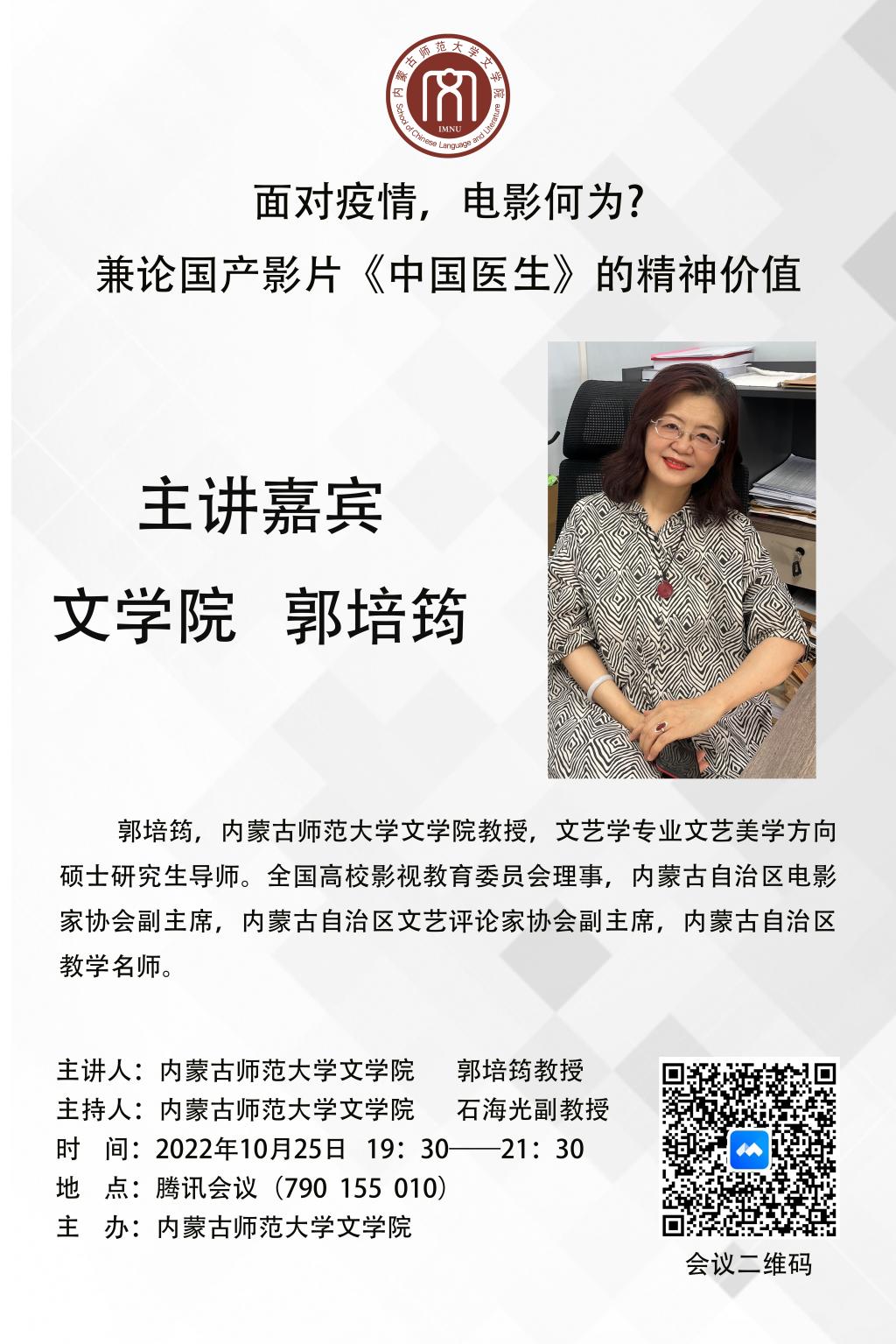 2022年10月25日,yl9193永利集团结合当前抗疫形势,组织了抗疫专题特别教研活动,由郭培筠教授做了题为《面对疫情,电影何为?——兼论国产影片<中国医生>的精神价值》的专场讲座。