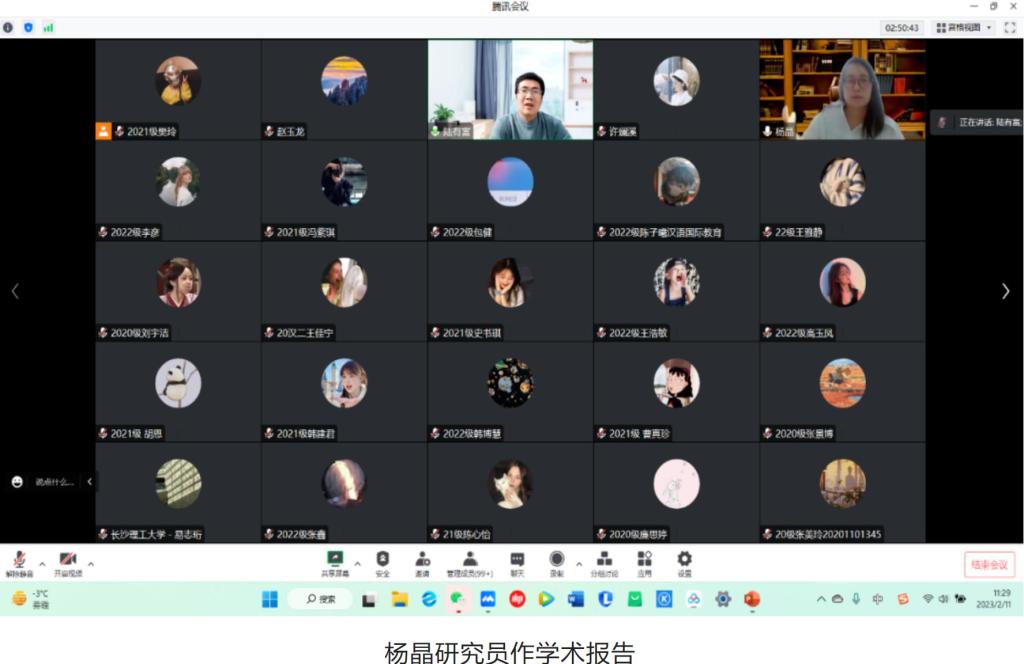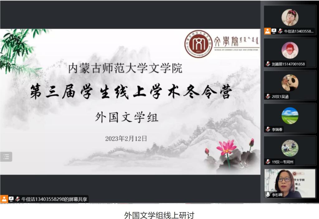 2023年2月12日,为期两天的yl9193永利集团学生线上学术冬令营活动圆满落下帷幕。本次冬令营面向全国高校在读中文专业学生招生,经过严格选拔,共招收学员130人,其中,除本院各年级各专业学生之外,还有来自西安外国语大学、中央民族大学、曲阜师范大学、陕西理工大学、安徽大学、长沙理工大学、呼伦贝尔学院、赤峰学院等高校的学生参加。活动形式主要包括知名专家学术讲座、校友报告、学术论文(读书报告)汇报与点评、营员研讨等内容。