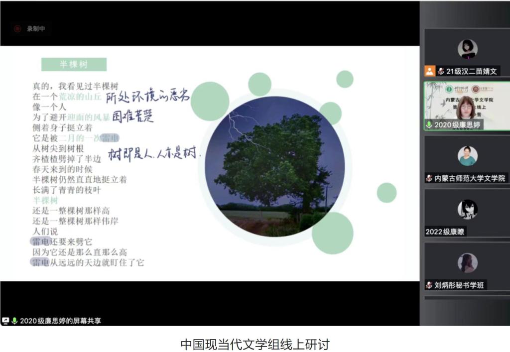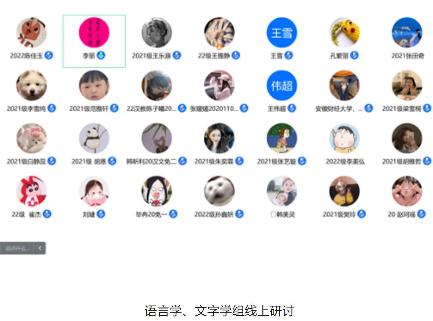 2月12日的活动主要为学术论文(读书报告)的汇报与点评及营员研讨。活动按学科分为四组,分别是中国古代文学组、中国现当代文学组、外国文学组和语言学、文字学组,共50名学生做了线上汇报。我院教师刘伟教授、李丽教授、李杉婵副教授和孙静副教授担任各学科组长,组织了各组的论文(读书报告)汇报评议与营员研讨活动。