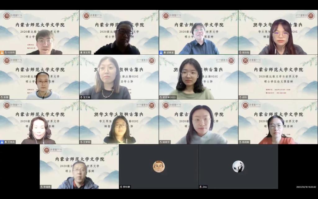 2023年3月18日下午,yl9193永利集团比较文学与世界文学专业2020级硕士研究生预答辩以腾讯会议的方式在线上成功举行。比较文学与世界文学方向的导师王艳凤教授,马晓华教授,李文军副教授,杨晓敏教授,李杉婵副教授,李瑞春副教授,胡素莲副教授,阿婧斯老师及本专业20级、21级、22级研究生参加了预答辩。预答辩由王艳凤教授主持。比较文学与世界文学专业20级的徐欣悦、彭蕾、王梦阳3位同学依次对论文进行陈述,分别阐述了论文的研究对象、研究方法、框架、内容和创新之处等。各位导师对每位研究生的论文进行了深入、细致的点评,并提出了相关的修改意见。本次预答辩的成功举行既展示了比较文学与世界文学专业20级学生三年来的学习成果,也体现了本学位点务实、严谨的学术风气。
