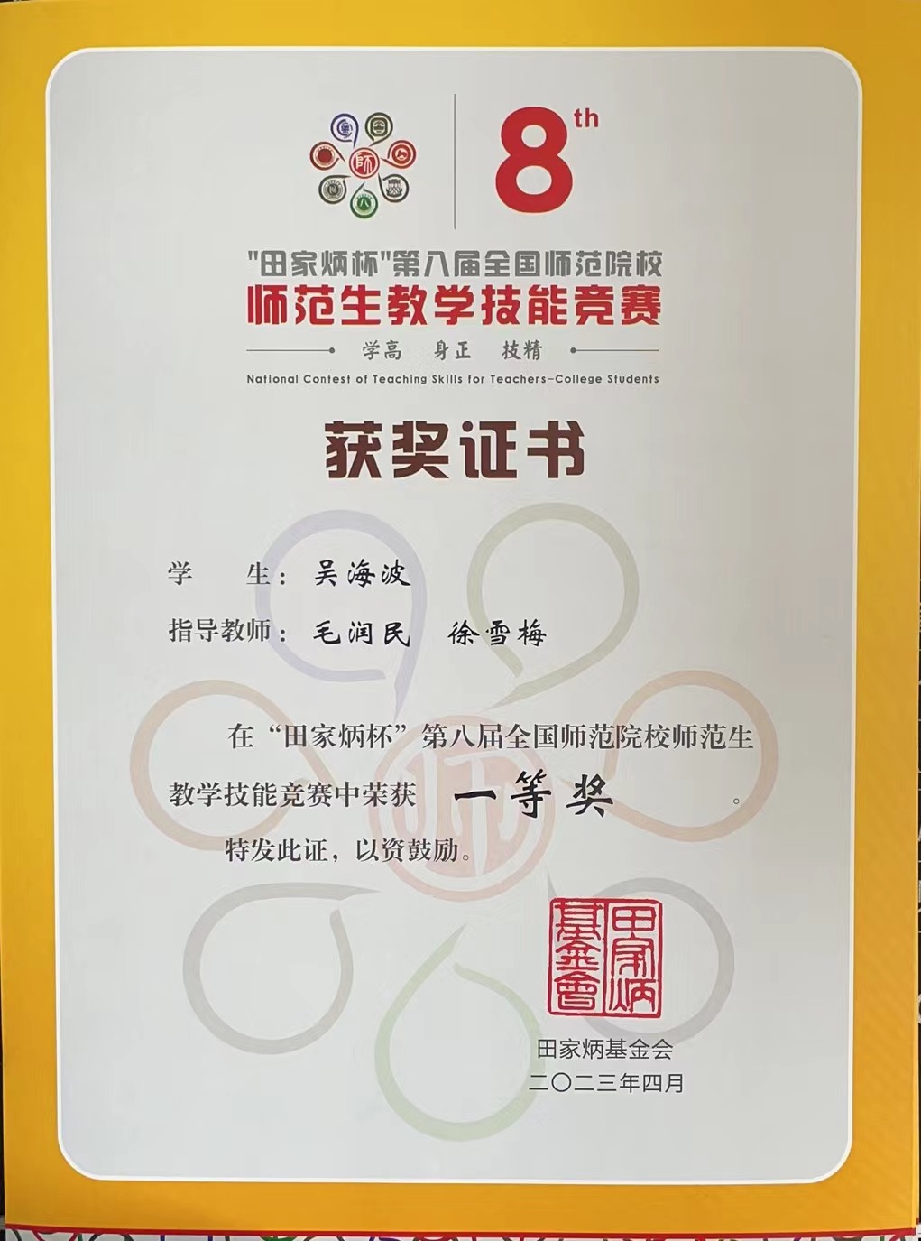 2023年4月14日至16日,在浙江师范大学举办的“田家炳杯”第八届全国师范院校师范生教学技能比赛汉语言文学组决赛中,yl9193永利集团2019级汉语言文学专业的吴海波同学荣获一等奖第三名的好成绩。