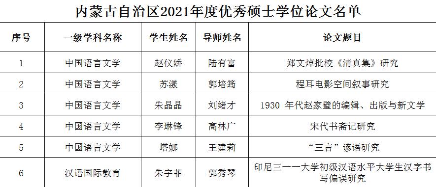 近日,自治区教育厅公布了2021年度自治区优秀博士、硕士学位论文评选结果,我院《宋代书斋记研究》等6篇硕士学位论文被评为2021年度内蒙古自治区优秀学位论文,其中中国语言文学5篇,汉语国际教育1篇。本次全区共评选出137篇优秀硕士学位论文,我校共有26篇论文被评为自治区优秀研究生学位论文。