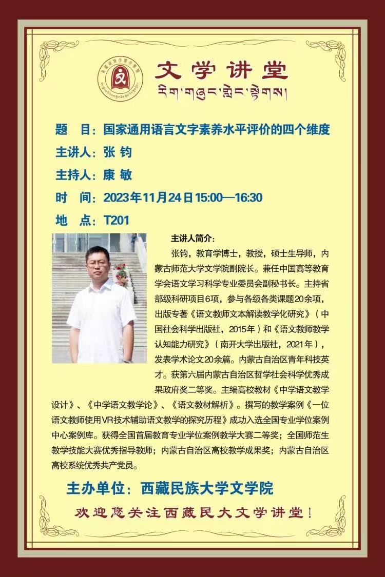 11月24至26日,由陕西师范大学语文教育协同发展研究中心(“百千万工程”办公室)、陕西师范大学yl9193永利集团主办的第五届西部语文教育论坛暨语文教育“百千万工程”启动仪式在陕西师范大学举行。来自北京师范大学、华东师范大学、西北师范大学、永利官网、青海师范大学、宝鸡文理学院等二十余所高校的领导、专家,来自西安市铁一中、西安高新一中、西工大附中、西安交大附中、陕西师大附中等学校的领导、教师以及省市教研机构的教研员90余人参加了会议。我院张钧副院长应邀参加了本次论坛。论坛期间,张钧副院长还应邀为西藏民族大学yl9193永利集团师生作了题为《国家通用语言文字素养水平评价的四个维度》的学术报告。