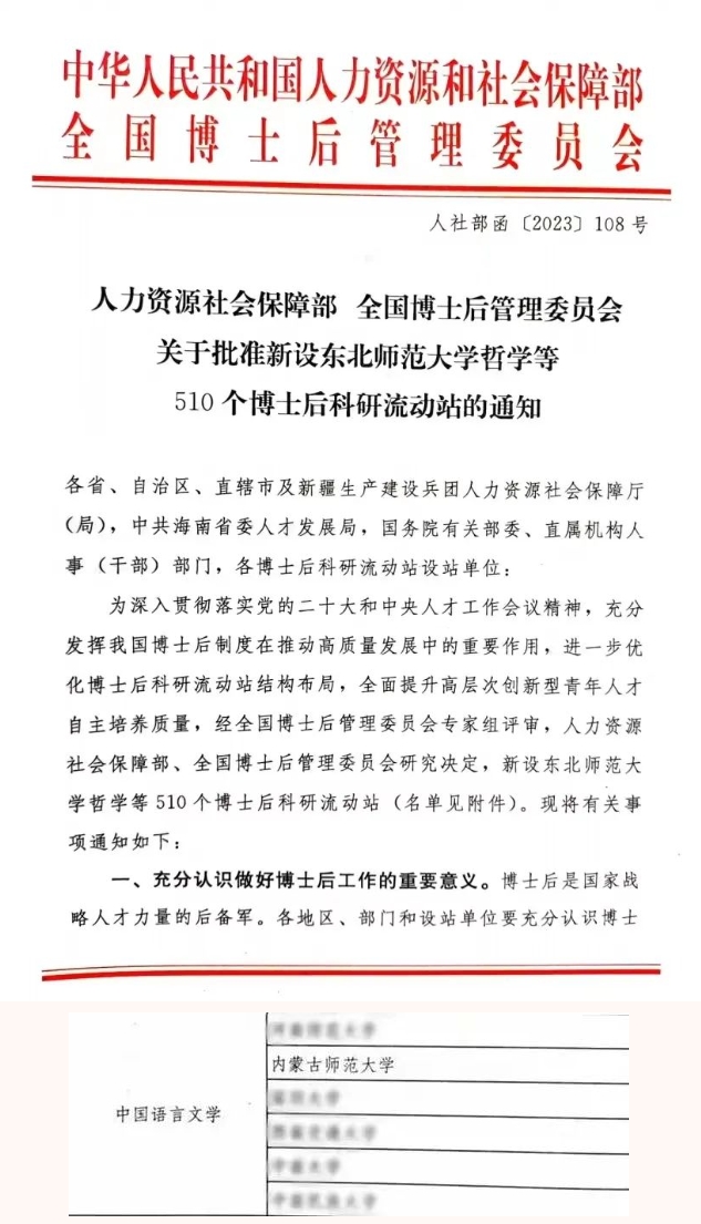 日前,国家人力资源和社会保障部、全国博士后管理委员会正式发布《关于批准设立东北师范大学哲学等510个博士后科研流动站的通知》(人社部函〔2023〕108号),公布了2023年批准新设博士后科研流动站名单。其中,永利官网获批新增中国语言文学博士后科研流动站。至此,学院在中国语言文学学科已全面建成本—硕—博—博士后贯通的完整人才培养体系
