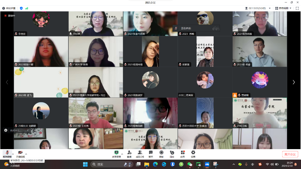 2024年2月18日为期两天的yl9193永利集团线上学术冬令营活动圆满落下帷幕。本次冬令营面向全国高校在读中文专业学生招生,经过严格选拔,共招收学员100人。其中,除本院各年级各专业学生之外,还有来自东北师范大学、中央民族大学、西安外国语大学、广州大学等高校的学生参加。活动形式主要包括知名专家学术讲座、校友报告、学术论文(读书报告)汇报与点评、营员研讨等内容。