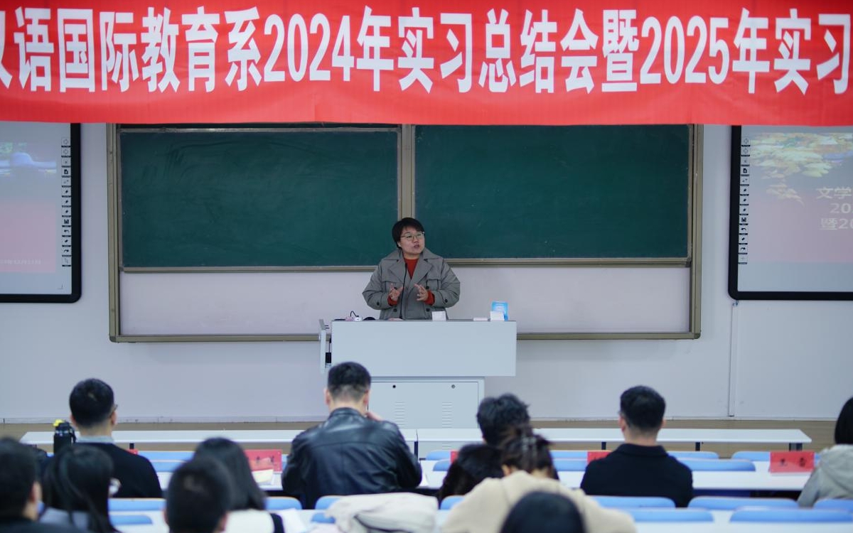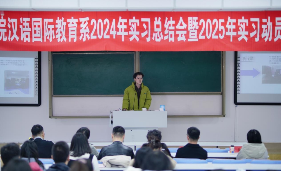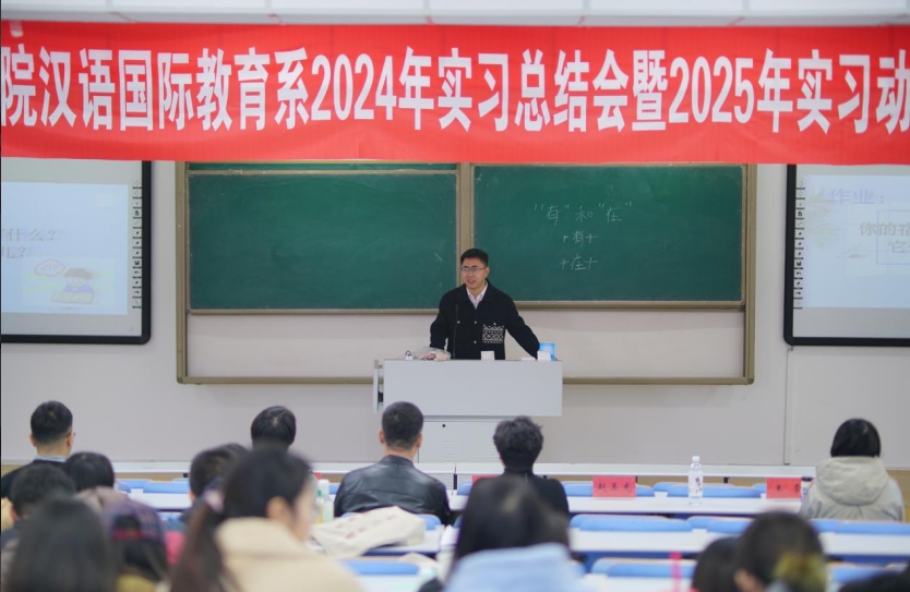 为总结和展望汉语国际教育系实习工作,引导2022级、2023级汉语国际教育班学生做好实习准备,推进汉语国际教育专业实习工作提质增效,我院于2024年11月21日下午,在盛乐校区行知楼118教室成功举办了汉语国际教育系2024年实习总结会暨2025年实习动员会。
