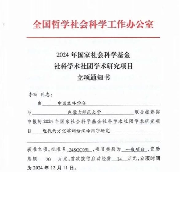我院李丽教授主持申报的“近代西方化学词语汉译用字研究”获批2024年国家社会科学基金社科学术社团学术研究项目。