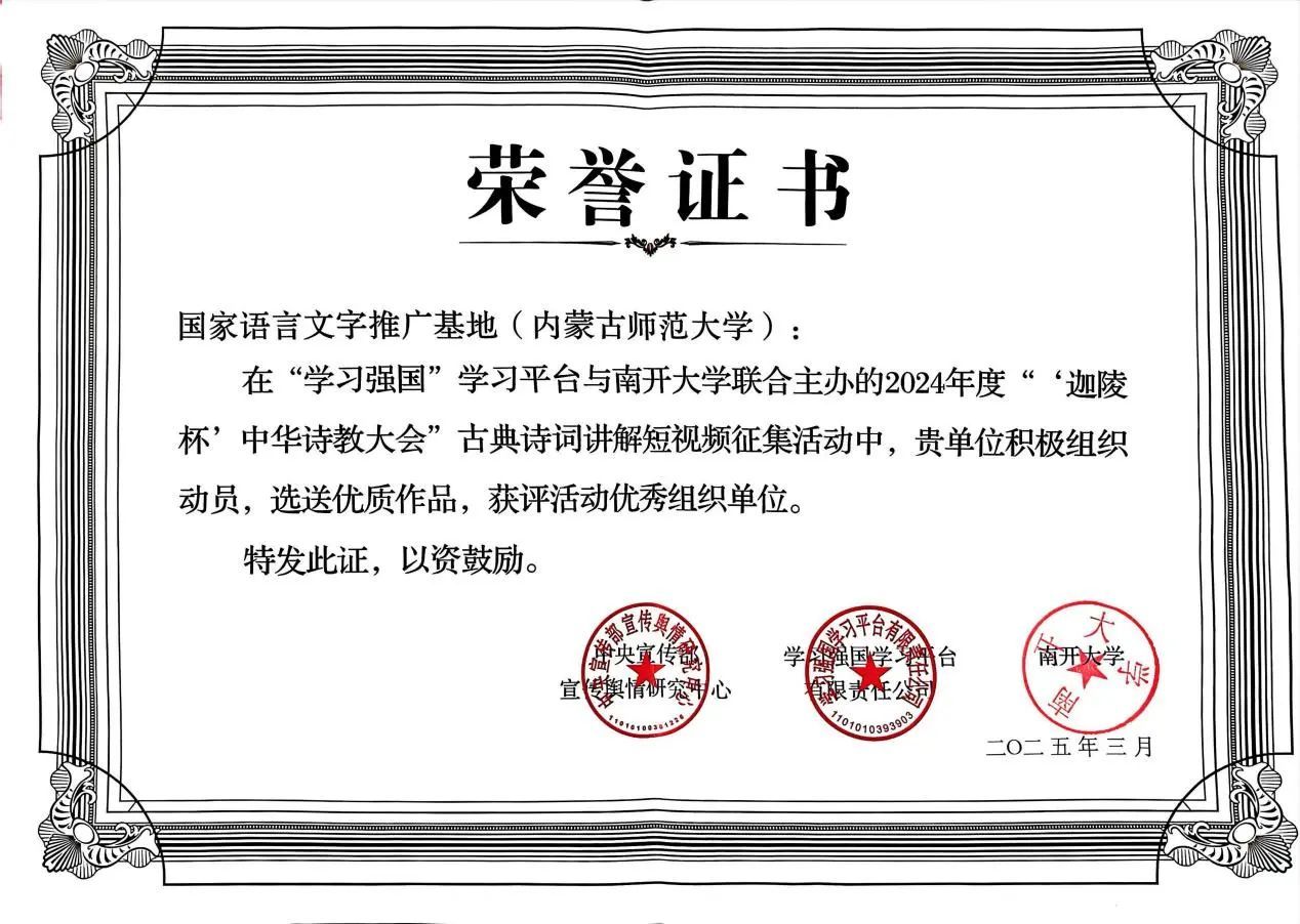 6月25日,首届“迦陵杯•中华诗教大会”在浙江杭州盛大启幕。中宣部宣传舆情研究中心、“学习强国”学习平台、南开大学共同授予国家语言文字推广基地(永利官网)2024年度“‘迦陵杯’中华诗教大会”优秀组织单位,以表彰国家语言文字推广基地(永利官网)在中华诗教传承推广中取得的突出成绩。