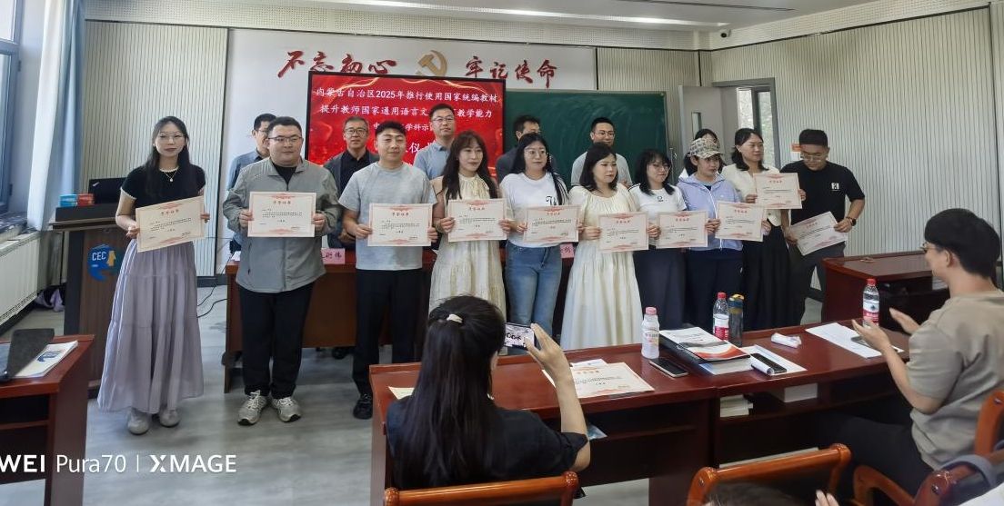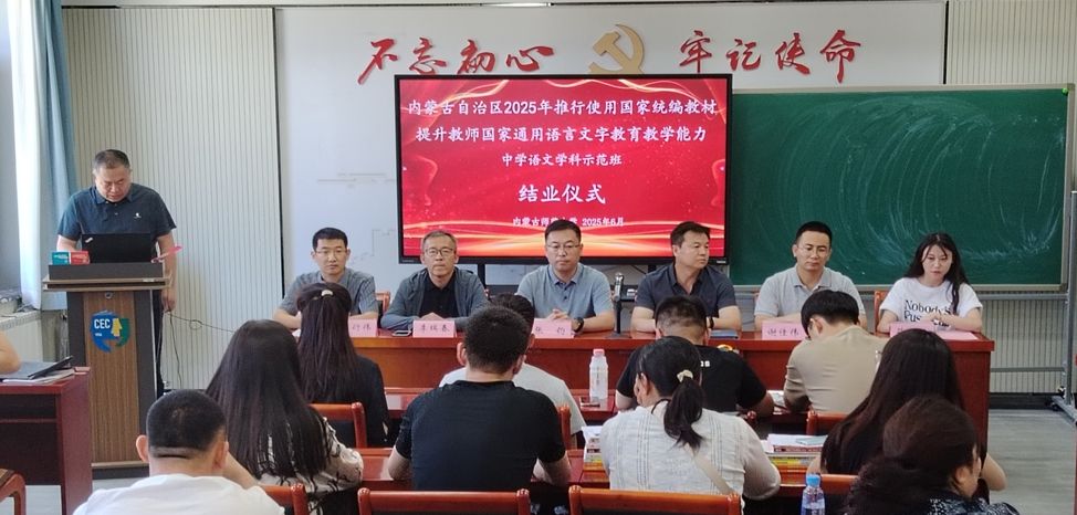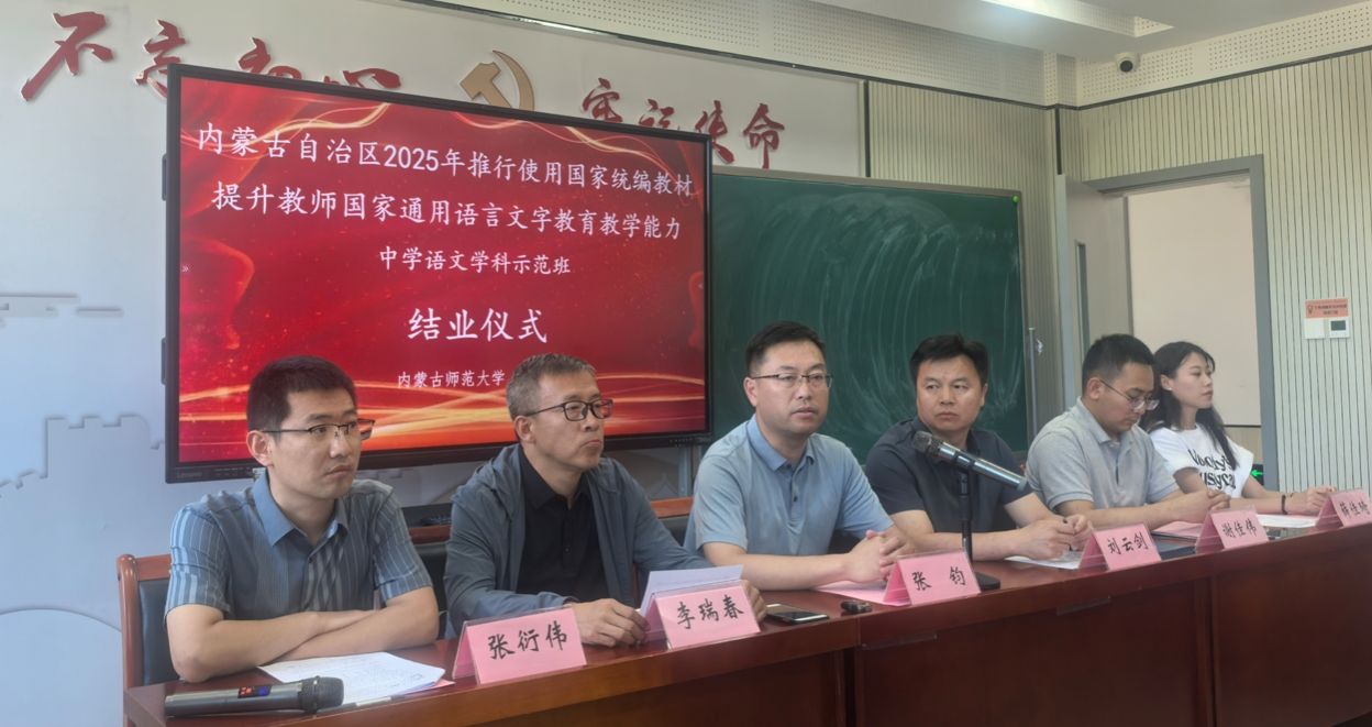 2025年6月20日,我院与继续教育学院、国家语言文字推广基地(永利官网)共同承担的内蒙古自治区2025年推行使用国家统编教材提升教师国家通用语言文字教育教学能力中学语文学科示范班培训工作圆满完成,参训的43位学员全部顺利结业,当日举办了隆重的示范班结业仪式。我院副院长张钧、汉语言文学系主任李瑞春、青年教师谢佳伟博士出席示范班结业仪式。