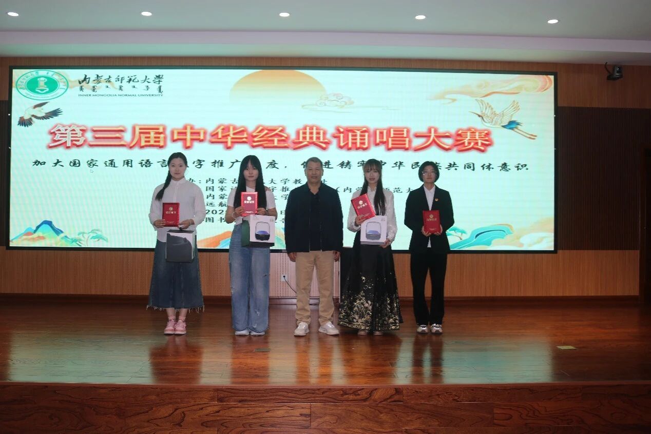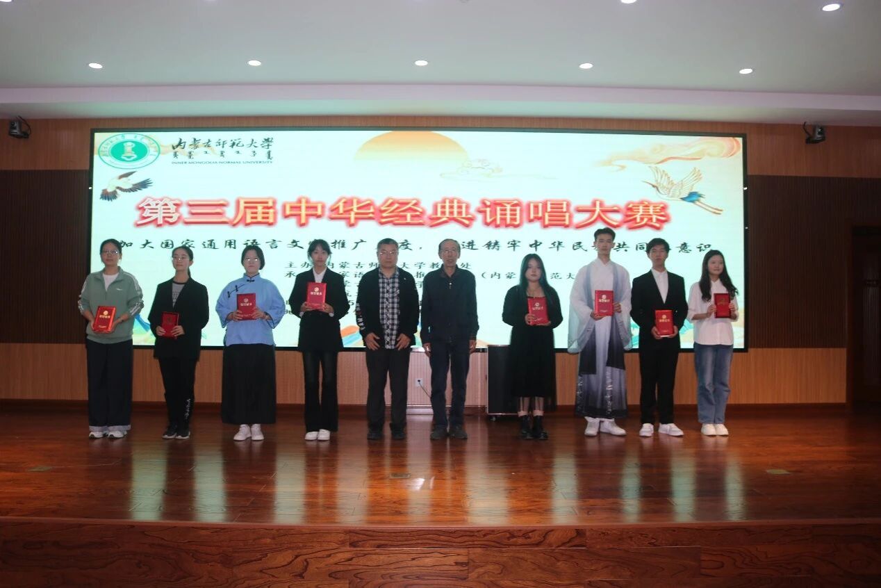 在第28届推广普通话宣传周期间,为深入贯彻落实党的二十大和二十届二中、三中全会精神,全面落实习近平总书记关于教育的重要论述和全国教育大会精神,服务国家战略、铸牢中华民族共同体意识,传承中华优秀语言文化,提升区域语言文字应用能力,进一步推动全民阅读活动深入开展,引导广大学生亲近中华经典,增强文化自信,提升我校大学生语言素养、构建文明和谐的书香校园,9月18日晚,由我校教务处主办,国家语言文字推广基地(永利官网)和yl9193永利集团承办的第三届中华经典诵唱大赛在我校盛乐校区顺利举办。本次诵唱大赛以“加大国家通用语言文字推广力度,促进铸牢中华民族共同体意识”为主题,赛事分为各院级单位初赛和校级决赛两部分,各学院共推荐作品41件,经选拔,共有17件作品参加决赛。大赛邀请教务处副处长苏贵斌,国家语言文字推广基地(永利官网)办公室主任高林广,yl9193永利集团副院长张钧,博士生导师张子程、付希亮担任评委。