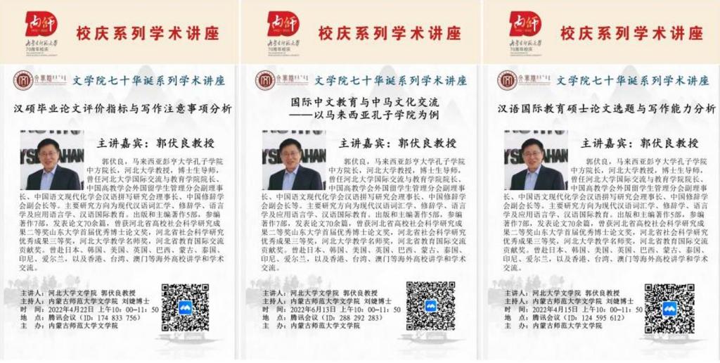 2022年4月15日至6月13日,马来西亚彭亨大学孔子学院中方院长、河北大学教授、博士生导师郭伏良教授应邀为我院师生作了关于汉语国际教育专业硕士研究生学位论文选题与写作的线上系列讲座。讲座共分为三次,分别于4月15日、4月22日、6月13日上午在腾讯会议平台举办。
