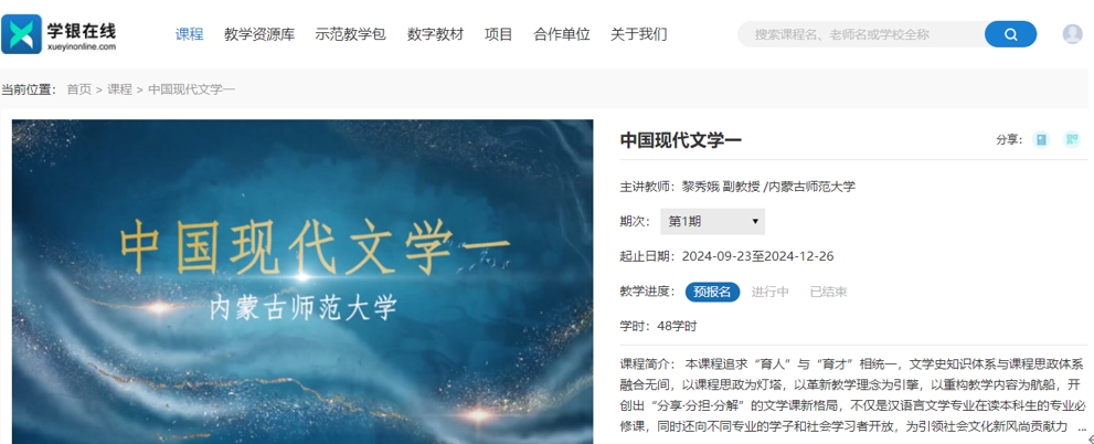 从9月25日开始,由我院教师黎秀娥主讲的专业必修课“中国现代文学(一)”以混合式课程开设。“中国现代文学(一)”线上课程于2024年9月10日正式投入使用,通过“学银在线”向社会学习者开放。结合我院专业课教学的班容量和教学实际,依托线上资源,yl9193永利集团现当代文学教研室着力将该门课程建设为了混合式课程,并且于本学期顺利开设。