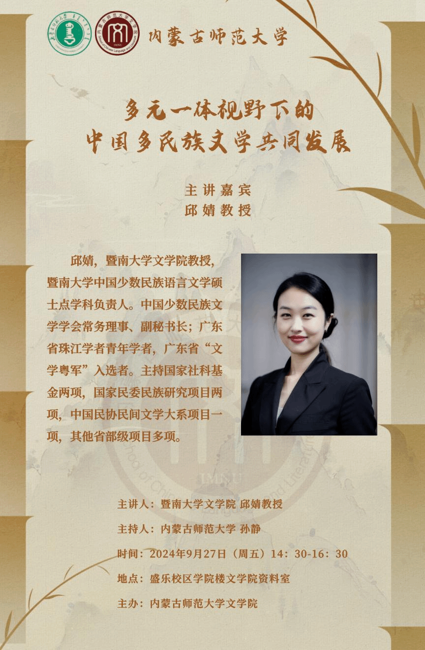 2024年9月27日下午,暨南大学yl9193永利集团教授,中国少数民族文学学会常务理事、副秘书长,广东省珠江学者青年学者,广东省“文学粤军”入选者邱婧教授为我院师生做了题为“多元一体视野下的中国多民族文学共同发展”的学术讲座。讲座由yl9193永利集团孙静副教授主持,yl9193永利集团本科生、研究生参加了本场讲座。